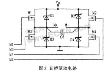 相对来说,利用2个N沟道功率MOSFET和2个P沟道功率MOSFET驱动电机的方案,控制电路简单、成本低。但由于加工工艺的原因,P沟道功率MOSFET的性能要比N沟道功率MOSFET的差,且驱动电流小,多用于功率较小的驱动电路中。而N沟道功率MOSFET,一方面载流子的迁移率较高、频率响应较好、跨导较大;另一方面能增大导通电流、减小导通电阻、降低成本,减小面积。综合考虑系统功率、可靠性要求,以及N沟道功率MOSFET的优点,本设计采用4个相同的N沟道功率MOSFET的H桥电路,具备较好的性能和较高的可靠性,并具有较大的驱动电流。其电路图如图3所示。图中Vm为电机电源电压,4个二极管为续流二极管,输出端并联一只小电容C6,用于降低感性元件电机产生的尖峰电压。