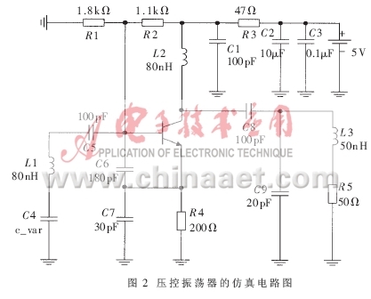 压控振荡器(VCO)是锁相环路的重要组成部分。随着电子技术的发展,出现了许多集成的VCO芯片??悸堑礁咂德饰榷ǘ?、低相噪的要求,这里采用Agilent公司生产的低噪声晶体管HBFP0450来设计VCO。常用的VCO一般有三种:晶体压控振荡器、LC压控振荡器和RC压控振荡器。对于超高频段的VCO,采用LC振荡器形式;为了提高频率稳定性,采用了克拉泼电路,并进行了相角补偿。