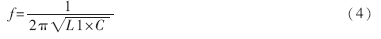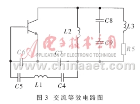 交流等效电路如图3所示。L1、C4和C5串联可以等效成一个电感,从而满足电容三端振荡器的相位条件。L1、C4、C5、C6、C7构成了谐振回路,振荡频率主要由这五个元件所决定。频率计算公式如下: