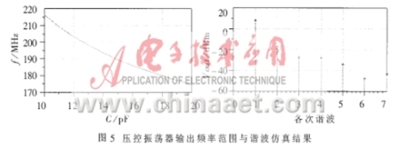 式中,fm为频偏,KVCO为VCO控制灵敏度,fo为振荡频率,Q为品质因数,F为晶体管的噪声系数,K为波尔兹曼常数,T为工作温度,Ps为振荡信号功率,fc为闪烁噪声拐角频率,Vm为低频噪声源的总幅度。从式(5)可以看出,选择噪声系数小的放大管、增加谐振回路有载Q值、减小VCO控制灵敏度、提高输出信号功率都可以降低相位噪声。通过减小变容管在谐振回路中的接入系数,可以有效减小VCO控制灵敏度,但是也会导致频率覆盖范围的减小,所以要适当选择接入系数。该VCO输出频率为200MHz时,变容管接入系数为0.63。通过适当调整输出回路的电感和分压电容,可以提高负载阻抗,从而有效地提高输出功率,以达到降低相位噪声的目的。通过软件仿真,在频偏10kHz处的输出相位噪声为-101.3dBc/Hz,在100kHz处的相位噪声为-122.5dBc/Hz。