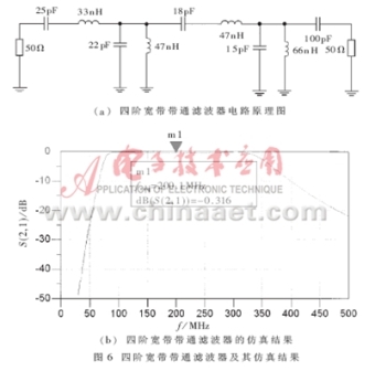 从图5可以看出,压控振荡器的输出频率范围为175MHz~217MHz,基波(频率为214MHz时)输出功率为7.911dBm,二次谐波为-16.368dBm,可见有效地抑制了谐波分量。在实际应用中,对谐波滤除的要求比较高,可以在输出端接入宽带滤波器,其电路原理图和仿真结果见图6。这样,可以更有效地滤除高次谐波,同时有利于输出匹配,减小负载对输出功率的影响。