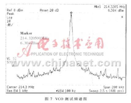 从图7的测量结果可以看出,频率范围、输出功率和相位噪声等指标与软件仿真结果一致。