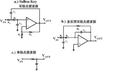 图4 Sallen-Key (a)和多反馈 (b)滤波器都是2阶,都有2个极点。单极点滤波器(c)是1阶滤波器。这些??榭梢约读?,以生成高阶滤波器。