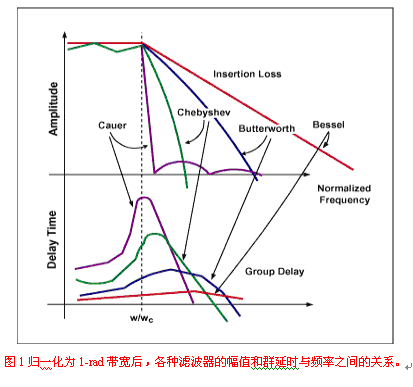 不论是用于抗混叠还是重建,滤波器都必须具备低通特性,使视频的帧频能够通过。因此,设计者需要谨慎考虑AC耦合。低通滤波器可以根据其幅度特性或用于描述它的多项式来分类(Bessel、Butterworth、Chebyshev或Cauer)。图1所示为归一化为1-rad带宽后这些滤波器的特性。通常应该选取具有最佳选择性与最小极点数(降低成本)的滤波器,但是对相位线性度的额外要求限制了可选择的范围。