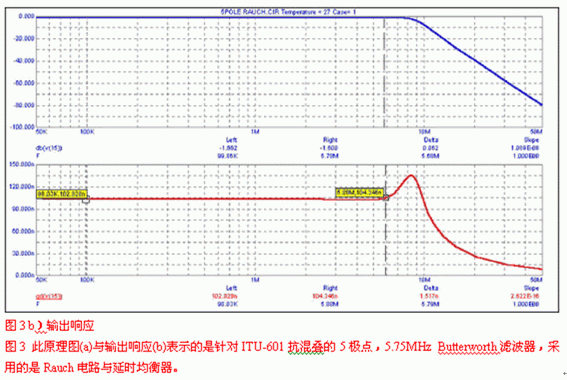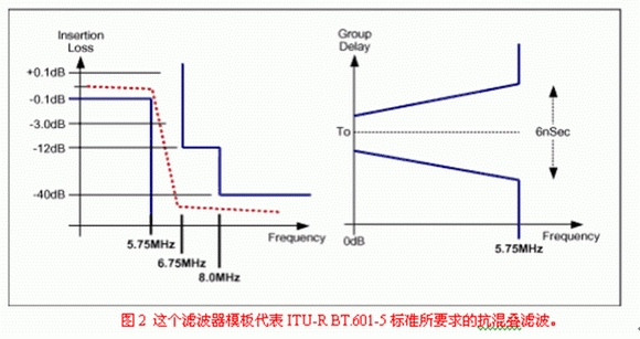 对于抗混叠滤波器,选择性由ITU-601规定的模板来确定,就像图2中所显示的。带宽规定为5.75MHz ( 0.1dB,插损在6.75MHz处为12dB,8MHz处为40dB,0.1dB带宽范围内群延时差异为(3ns。这样的性能要求对于单纯的模拟滤波器来讲太困难了,但是通过四倍过采样可以将该要求调整为27MHz处12dB,32MHz处40dB。