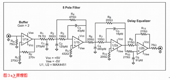 使用软件或归一化曲线,我们会发现-3dB带宽为8.45MHz的5极点Butterworth滤波器就能满足选择性要求,但没考虑群延时。对于后者,需要一个延时级,对于此电路,需要重点关注的运放参数为0.1dB,2VP-P带宽。将该数值应用于式1和2可获得精确的设计。图3a与3b给出了一个适合此类应用的原理图,并用曲线显示了它的增益和群延时特性,此设计基于四倍过采样系统。由于MAX4450/4451卓越的瞬态响应与大信号带宽(2VP-P时175MHz),因此选择它。