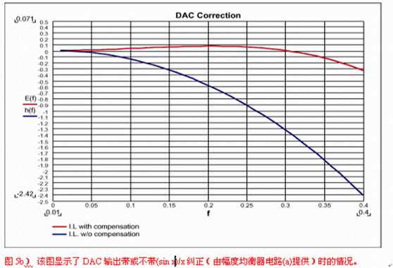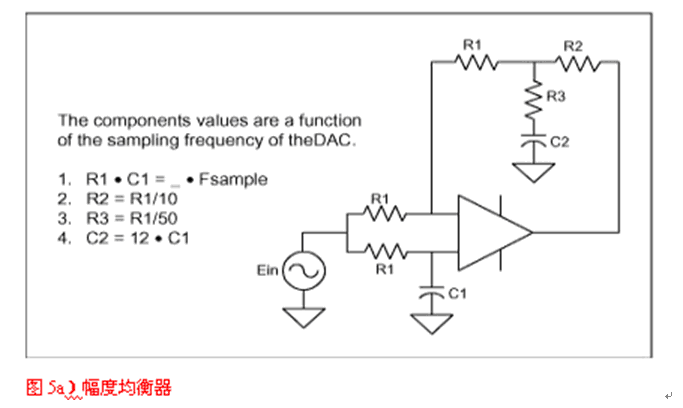 DAC之后的重建滤波是没有被很好理解的应用之一。很多设计者认为引入重建滤波器是为了滤掉采样时钟,但这远不是事实。当信号被采样时,采样中包含了多个重复的信号映像,分别对准采样时钟的各次谐波。重建滤波器将滤掉除基带采样外的所有其他信号。如果抗混叠滤波器达到了其目的,那么DAC输出看上去就像图4中的映像A,接下来,它右边的所有采样都应被滤掉。因此,对于重建的要求类似于抗混叠,但是,由于每个采样只停留瞬间,DAC会将每个采样保持一个时钟周期,这样一来,就产生了我们所熟悉的逼近于某斜线的台阶状波形。保持功能相当于一个数字滤波器,它的特性类似于Butterworth或Bessel滤波器,在半采样频率处响应被降低了4dB。重建滤波器的第二个目的是补偿这个损失,这就需要如图5a电路那样的幅度均衡器。该均衡器在一个延时电路的基础上构成,具有类似于Bessel滤波器的响应。它可按照DAC采样率(FS)来设计。图5b显示了采用和未用幅度均衡器时的DAC频率响应。与延时级类似,它可以被包含在任何重建滤波器中。