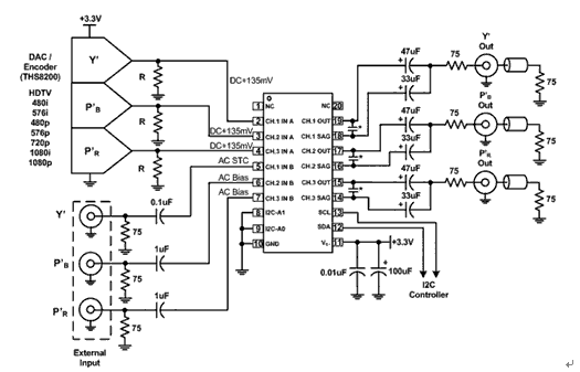 为了提高灵活性,THS73x3的每个通道必须能实现独立控制。利用这一特性,我们就能选择35MHz以支持Luma通