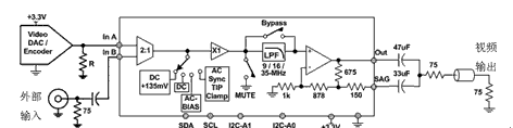 如果系统设计中已经采用了THS7303或THS7313 6dB增益放大器,并采用了参考接地的DAC或编码器驱动,那么DC输入模式会很理想。问题在于,DAC生成的电压有多低?如果同步信号(通常这是视频信号中电压最低的)电压低于50mV,那么6dB放大器的输出就应生成低于100mV的电压,由于CMOS和双极放大器都存在晶体管饱和方面的限制,因此这对任何放大器来说都是很难做到的。