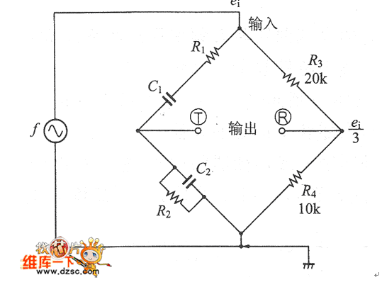 图1是由电容的串/并联电路(也称特尔曼式电路)和阻抗分压电压(R3、R4)构成的文氏电桥电路。