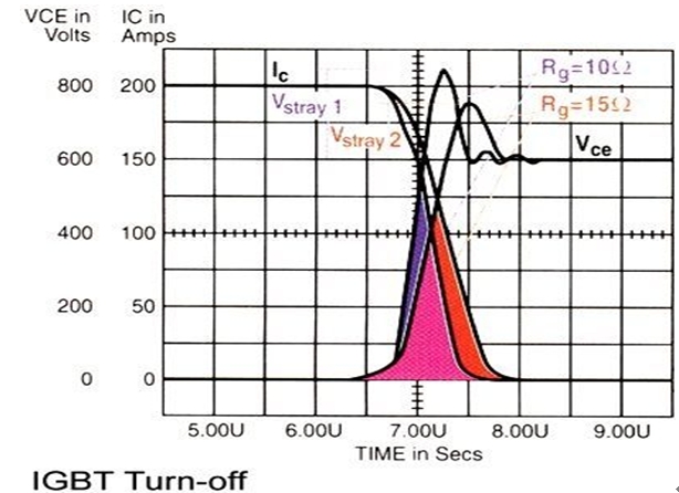 每个IGBT开关特性的设定可受外部电阻RG的影响。由于IGBT的输入电容在开关期间是变化的,必须被充放电,栅极电阻通过限制导通和关断期间栅极电流(IG)脉冲的幅值来决定充放电多长时间(见图1)。由于栅极峰值电流的增加,导通和关断的时间将会缩短且开关损耗也将会减少。减小RG(on)和RG(off)的阻值会增大栅极峰值电流。当减小栅极电阻的阻值时,需要考虑的是当大电流被过快地切换时所产生的电流随时间变化特性di/dt。电路中存在杂散电感在IGBT上产生大的电压尖峰。这一效果可在图2所示的IGBT关断时波形图中观察到。图中的阴影部分显示了关断损耗的相对值。集电极-发射极电压上的瞬间电压尖峰可能会损坏IGBT,特别是在短路关断操作的情况下,因为di/dt比较大??赏ü黾诱ぜ缱璧闹道醇跣stray。因此,消除了由于过电压而带来的IGBT被损毁的风险??焖俚牡纪ê凸囟匣岱直鸫唇细叩膁v/dt和di/dt,因此会产生更多的电磁干扰(EMI),从而可能导致电路故障。表1显示不同的栅极电阻值对di/dt的影响。