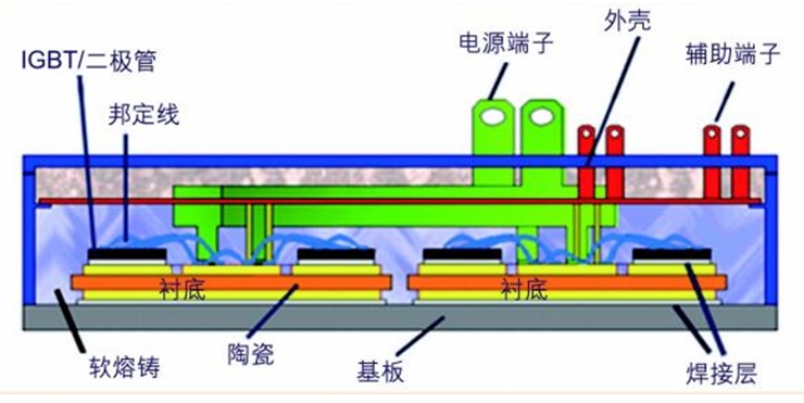 各种工业应用中通?;崾褂枚啻锸钢值木嫡に骞?IGBT),设计IGBT模块的目的就是为了向某种专门的应用提供最优的性价比和适当的可靠性。图1为现有的IGBT功率模块的主要组成部分。