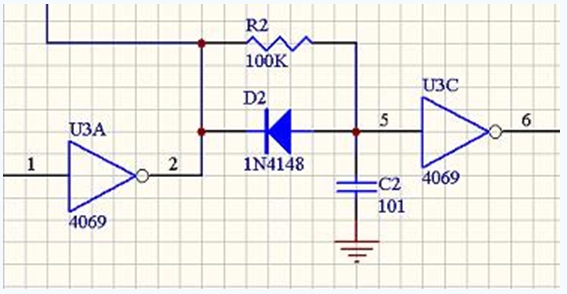 这个电路要求在IN端输入的是边缘陡峭的方波脉冲,因此控制信号从单片机或者其他开路输出的设备接入后,要经过施密特触发器(比如555)或者推挽输出的高速比较器才能接到IN端。如果输入边缘过缓,二极管延时电路也就失去了作用。