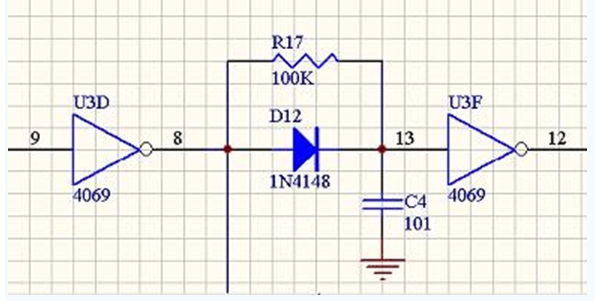 在前级逻辑电路里,有意地对控制PMOS的下降沿和控制NMOS的上升沿进行延时,再整形成方波,也可以避免场效应管的共态导通。另外,这样做可以使后级的栅极驱动电路简化,可以是低阻推挽驱动栅极,不必考虑栅极电容,可以较好的适应不同的场效应管。2003年Robocon比赛采用的就是这种驱动电路。下图是两种边沿的延时电路: