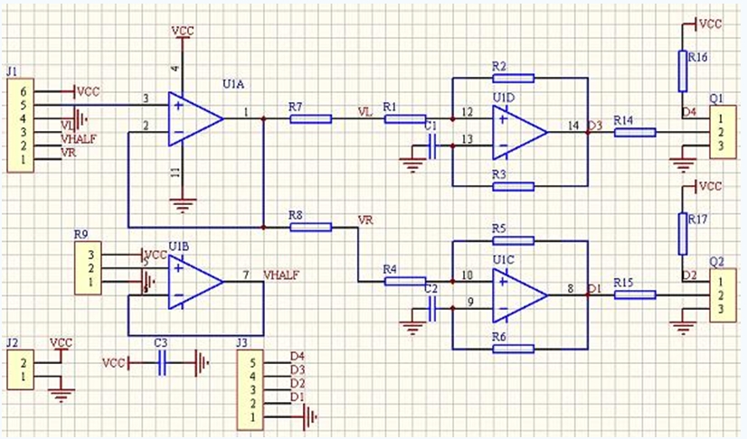 上图为一个使用游戏手柄或者航模摇杆上的线性电位器(或线性霍尔元件)控制两个底盘驱动电机的PWM生成电路。J1是手柄的插座,123和456分别是x,y两个方向的电位器。U1B提供半电源电压,U1A是电压跟随。x,y分量经过合成成为控制左右轮两个电机转速的电压信号。在使用中,让L=(x+1)y/(x+1。4),R=(x-1)y/(x-0。6),经过试验有不错的效果(数字只是单位,不是电压值)。经过U1C和U1D组成的施密特振荡器把电压转换为相应的PWM信号,用来控制功率驱动电路。以U1D为例,R1,R2组成有回差的施密特电路,上下门限受输入电压影响,C1和R3组成延时回路,如此形成振荡的脉宽受输入电压控制。Q1,Q2是三极管,组成反相器,提供差分的控制信号。具体振荡过程参见对555振荡器的分析。