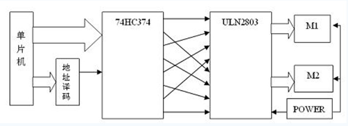 达林顿管阵列ULN2803分别从锁存器取出第0,2,4,6位和1,3,5,7位去驱动两个步进电机。四相步进电机的通电顺序可以有几种:A,B,C,D(4相4拍);AB,BC,CD,DA(4相双4拍);A,AB,B,BC,C,CD,D,DA(4相8拍)。为了兼顾稳定性,转矩和功耗,一般采用4相8拍方式。所有这些方式都可以通过循环移位实现(也要有定期监控),为了使4相8拍容易实现,锁存器与驱动部分采用了交叉连接。