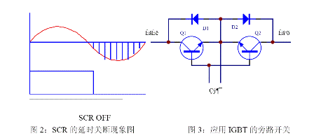 旁路开关常使用继电器和可控硅。继电器在中小功率的UPS 中广泛应用。优点是控制简单,成本低,缺点是继电器有转换时间,还有就是机电器件的寿命问题??煽毓璩<谥写蠊β蔝PS 中。优点是控制电流大,没有切换时间。但缺点就是控制复杂,且由于可控硅的触发工作特性,在触发导通后要在反向偏置后才能关断,这样就会产生一个最大10ms 的环流电流,如图2。如果采用IGBT,如图3,则可以避免这个问题,使用IGBT 有控制简单的优点,但成本较高。其工作原理为:当输入为正半周时,电流流经Q1、D2,负半周时电流流经D1、Q2。