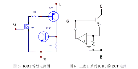 IGBT 有一定抗过电流能力,但必须注意防止过电流损坏。IGBT 复合器件内有一个寄生晶闸管,所以有擎住效应。图5 为一个IGBT 的等效电路,在规定的漏极电流范围内,NPN 的正偏压不足以使NPN 晶体管导通,当漏极电流大到一定程度时,这个正偏压足以使NPN 晶体管开通,进而使NPN 和PNP 晶体管处于饱和状态,于是寄生晶闸管开通,门极失去了控制作用,便发生了擎住效应。IGBT 发生擎住效应后,漏极电流过大造成了过高的功耗,最后导致器件的损坏。