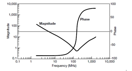 图2:1000-pF陶瓷电容器的典型阻抗幅相特性。
