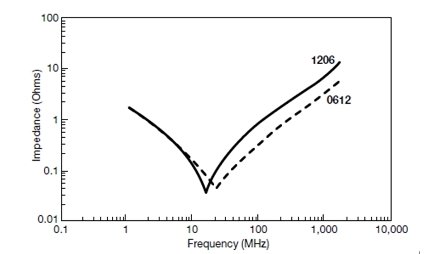 对于各类表面贴装的不同封装的电感值,可以利用方程2中所描述的测量技术来计算。例如,如果系统中产生了800MHz的噪声,随后可以在PCB上将其定位到一个确定的区域。选择一个标称容量为39pF的电容,并将其安装到尽可能靠近产生噪声的地方,这对于减小EMI来说,将是最好的选择。减小矩形芯片电感的一个有效方式就是改进芯片纵长方向端头的设计。所选电容器的阻抗曲线如图4所示。注意通过改变纵横比,寄生电感减小了大约50%,即从1200pH减小到600pH。这有效地偏移开了最大衰减点,故在利用这些器件来进行EMI滤波时只需牢记这一点。
