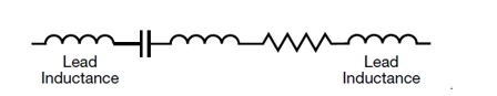 引脚电容相对于表面贴装电容器,除了增加了引脚之外,其他并没有什么不同。其等效模型与MLCC模型一样,除了增加了引脚所产生的电感之外,见图5。
