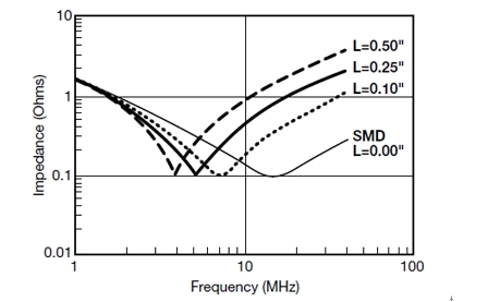 引脚所产生的电感对阻抗的影响如图6所示。一个很好的经验算法是,电路板上每0.10"的引脚长度将产生2.5nH的电感。就像低电感电容器将频率向高处偏移一样,引脚器件将频率往低端偏移。要实现最佳的EMI滤波,必须牢记这一点。