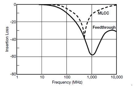 对于寄生参数来说,这种几何结构具有几个有趣的问题。首先,电容器的寄生电感要比具有等效电容的相当尺寸的片式电容器要小得多??梢圆饬看┬牡缛莸募纳绺校笤嘉?50pH。该相同的现象是在降低了电感的同时也降低了ESR(通道长度,通道长度,通道长度!)最后,穿通部分中电感的引入将增加衰减带宽。图8给出了一只100pF的穿心电容和一个等效的标准片式电容之间的插入损耗比较。
