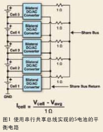 改善这种状况的方法被称为平衡。平衡是强制所有电池具有相同电压的过程。这是通过平衡电路实现的。Aeroflex 平衡电路使用共享总线,这个总线的电压等于所有电池的平均电压。平衡电路由那些超过共享总线电压的电池充电并将电能注入到电压较低的电池,这个工作是通过高效率的双边DC/AC转换器来完成的。平衡电流的大小与电压差成正比,也就是说,随着电池越来越接近理想平衡状态,平衡电流将趋近于0。图1显示了一个用于5个电池的平衡电路,其中,1 Ω电阻确定了传输比,也就是不平衡电压与平衡电流的比值。对于容量较大(通常20Ah或更高)的电池而言,为了将达到平衡的时间减到最短,需要高达1A的平衡电流。对这些应用而言,双DC/AC转换器电路通过平面变压器工作在100kHz的频率附近。