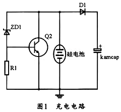 本系统中的充电电路由防过压和防反充电路构成,图1所示为其充电电路,图中的ZD1为5.6V稳压二极管,当电池电压高于5.6 V时,Q2导通,硅电池全部电流通过电阻Q2消耗掉,当硅电池电压降到5.6 V以下时,Q2截至,硅电池给超级电容充电,并同时?;こ兜缛?。