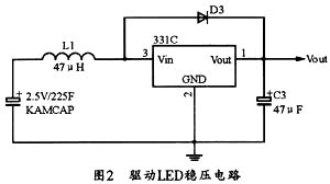由于所选用的LED灯的额定电压为3.3 V,而超级电容器的电压为5.0 V,并且超级电容器在放电过程中电压会不断降低,因此需要有稳压电路来驱动LED。