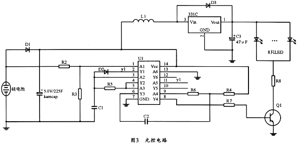 图3中,U1为带施密特触发器的六反相器74HC14,其中的多谐振荡器由第二个反相器与R5和C1构成。这样,在白天光线变亮时,太阳能电池电压升高,74HC14的1脚为高电平,74HC14的2脚为低电平,8脚同样输出低电平,三极管Q1截至,LED关断。而当光线变暗时,太阳能电池电压降低到一定程度时,HC14的1脚为低电平,HC14的2脚为高电平,多谐振荡器开始振荡,并经过Y4输出高、低电平,Q2时而导通时而截至,此时只要调节R6和C1的值,以把闪光频率调节到人眼不能分辨即可,这样做的最大好处是可以延长草坪灯工作时间。经实际测试,该电路可以每天连续工作10小时以上,完全可以达到用户的使用需求。