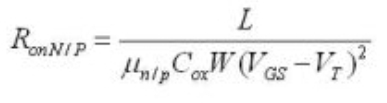 低导通电阻是模拟开关在音频切换用途时的主要选择因素。值得注意的是,导通电阻是针对具体的VCC 、VIN(电压输入)及给定负载电流而定义的。在晶体管级,RON为起始长度(L)、宽度(W)、电子与空穴迁移率、氧化层电容、门限电压及信号电压的函数。如下所示: