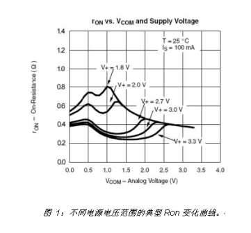 RON会随着电源电压的增加而减小。图1显示了上海英联电子科技有限公司(下文简称英联电子)的UM4684在不同电源电压上测得的RON。导通电阻平坦度(RFLAT)即表示RON随着VIN在0V至VCC或V-至V+)间变化而变化的情况,它是引起THD的主要原因。
