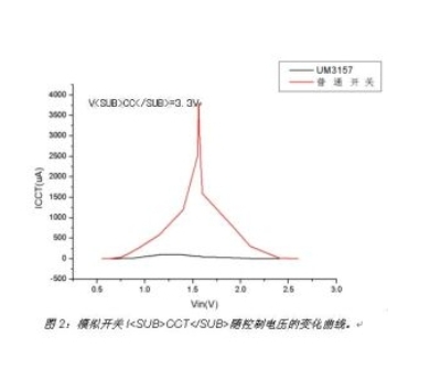 对于某些开关,电流消耗甚至高达几毫安,对功耗敏感的便携式设备而言,这样的功耗是无法接受的。大多数标准模拟开关的产品说明书只给出了典型情况下(即开关输入控制信号的高电平与开关供电电压一致)的功耗指标,这容易让设计工程师感到混淆,他们会惊奇地发现在低压ASIC设计中的模拟开关竟有几毫安的漏电流。英联电子的模拟开关改善了控制电路的输入缓冲器,只要芯片的控制输入电压大于VIH或小于VIL内,而不是等于0V或VCC,也能保持非常小的功耗。从图2可看到采用该技术的英联电子UM3157模拟开关与普通的同系列模拟开关在ICCT上的显著区别。 [page]