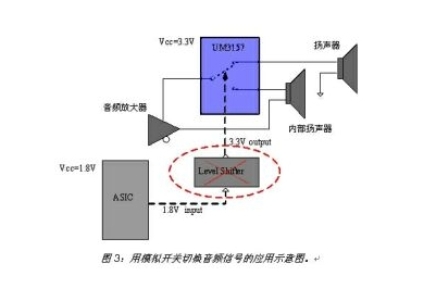 此外,英联电子的低ICCT系列模拟开关具有更低的VIH电平值,可以采用较低的控制电平实现开关的高电平切换控制。这种特性大大减少了电路复杂性,特别是在供电电源和控制信号电平不匹配的便携产品应用中,可省去电平转换???,从而有效降低了成本。以图3所示的模拟开关切换音频信号为例,如果采用ASIC输出的1.8V电平作为UM3157控制管脚的输入,则不必采用电平转移器,就能在漏电流很小的情况下实现开关切换。此外,由于低ICCT模拟开关的电流功耗很低(大约1uA),且开关的导通电阻随工作电压的增加而降低,所以可以采用较高的供电电压来实现更低的导通电阻。低导通电阻对典型的音频开关或USB应用而言非常重要。