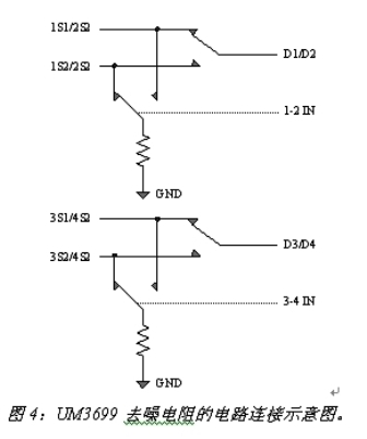 在音频电路中,当模拟开关断开时,由于寄生电容和电容失配,电容上的电荷无法释放,从而导致耳机上的噪声??梢酝ü诳囟峡苯油ㄒ桓鋈ピ氲缱?,来快速释放电荷,从而提高音频切换质量。图4是英联电子的UM3699在开关切换时去噪电阻的连接示意图。