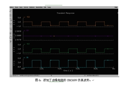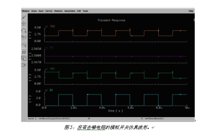 图5是没有采用去噪声电阻时模拟开关的仿真波形图。D1为输入的数据信号。IN为选择端信号。当IN为高电平时,开关通向1S1;当IN为低电平时,开关通向1S2。当开关断开时,由于寄生电容和选择端切换脉冲的存在,开关到地之间是高阻态,所以寄生电容的电荷没有放电回路。这样,开关的关断端在较长的时间内将出现一个比输入数据信号更高的电平,从而导致噪声。图6是采用图4中的去噪电阻后开关切换的仿真波形图。由于开关断开后连接了去噪电阻上,形成一个对地的放电回路,所以寄生电容上的电荷得以很快释放,从而消除了开关切换时的干扰电平,提高了开关在音频切换应用时的声音质量。