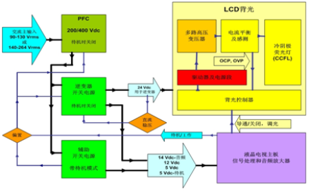 目前,上述传统电源仍然占市场上的液晶电视电源的大多数。为了符合各种能效规范,降低较大尺寸液晶电视的电能消耗,降低系统成本及减小解决方案尺寸,使之更受消费者青睐,可以通过多种途径设计液晶电视电源。