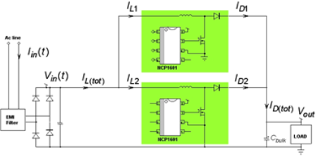 而在PFC方面,采用安森美半导体的NCP1606和NCP1654等PFC控制器,已经可以将液晶电视厚度降到较低;为了支持低至10 mm的极纤薄设计,可以采用两颗相对较小的NCP1601芯片,用交错式架构来来实现,如图3所示。交错式PFC是在原来放置单个较大PFC的地方并行放置两个功率为一半的较小PFC。这两个较小PFC以180°的相移交替工作,在输入端或输出端累加时,它们可以抵消每相电流纹波的主要部分。