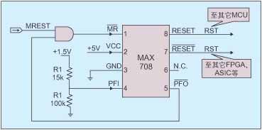 需要指出的是,MAX708本身可以监控VCC电压(这里为5V),这对电路采用多电源??榈纳杓剖呛苡杏玫?。因为两个电源??橄嗷ザ懒?,5V和1.5V可能不是源于同一个电源模块,所以在监控1.5V的同时也需要监控5V电压。