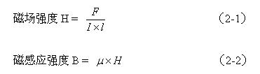 (2-1)式中磁场强度H的单位为奥斯特(Oe),力F的单位为牛顿(N),电流I的单位为安培(A),导线长度的单位为米(m)。(2-2)式中,磁感应强度B的单位为特斯拉(T), 为导磁率,单位为亨/米(H/m),在真空中的导磁率记为 , = 1。由于特斯拉的单位太大,人们经常使用高斯(Gs)作为磁感应强度B的单位。1特斯拉等于10000高(1T=104Gs)。