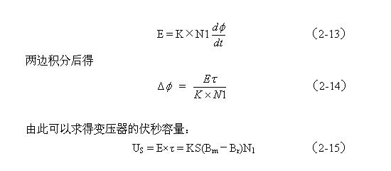 上面(2-13)、(2-14)、(2-15)式中,US为变压器的伏秒容量,US = E×τ ,即:伏秒容量等于输入脉冲电压幅度与脉冲宽度的乘积,单位为伏秒,E为输入脉冲电压的幅度,单位为伏,τ为脉冲宽度,单位为秒;Δ