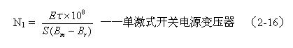 (2-16)式就是计算单激式开关电源变压器初级线圈N1绕组匝数的公式。式中,N1为变压器初级线圈N1绕组的最少匝数,S为变压器铁芯的导磁面积(单位:平方厘米),Bm为变压器铁芯的最大磁通密度(单位:高斯),Br为变压器铁芯的剩余磁通密度(单位:高斯),τ为脉冲宽度,或电源开关管导通时间的宽度(单位:秒),E为脉冲电压幅度,即开关电源的工作电压幅度,单位为伏。