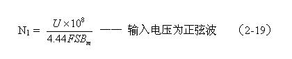 (2-19)式为计算正弦波电源变压器初级线圈N1绕组匝数的公式。式中,N1为变压器初级线圈N1绕组的最少匝数,S为变压器铁芯的导磁面积(单位:平方厘米),Bm为变压器铁芯的最大磁通密度(单位:高斯),U为正弦波输入电压有效值,单位为伏,F为正弦波的频率,单位赫芝。