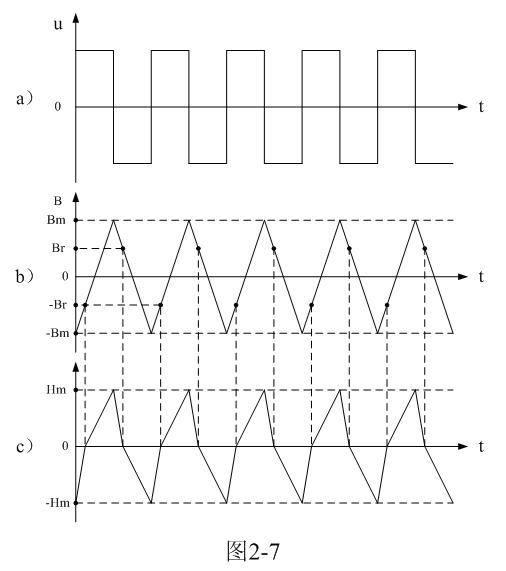 由(2-13)和(2-14)式可以知道,尽管磁化曲线不是线性的,但当输入电压为方波时,流过变压器初级线圈励磁电流所产生的磁通还是按线性规律增长的;而流过变压器初级线圈励磁电流以及磁场强度却不一定是按线性规律增长,正因为如此,才使得(2-13)和(2-14)式中出现一个比例常数K 。
