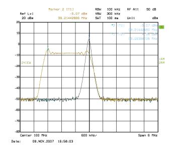 另一种可行解决方案是使用展频振荡器(Spread Spectrum Oscillator),来降低系统辐射出来的EMI电磁辐射干扰。图4则显示一个单频信号的频谱图以及对该信号展频后的频谱图。从图中可知展频后的频率信号如何降低原来在接近100MHz的峰值。