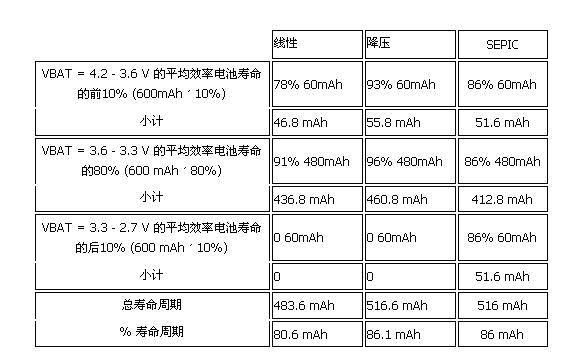 从表面上来看,设计人员若能继续使用电池直到2.7V,并利用正电源降压—升压转换器或是SEPIC转换器提供3.3V电源,可携式装置的电池寿命就会大幅延长,但是根据(表一)针对600mAh电池所做的简单分析可发现情形并非如此,因为无论是采用效率更高的降压转换器,并将电池使用到3.3V,或是采用SEPIC之类的转换器,并将电池电力完全用尽,这两种方式的供电时间几乎没有任何区别。