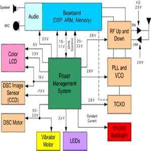 不同的智能型手机零件有着不同的电源需求,(图二)是行动电话中需要电源的主要零件简单方块图,例如射频单元的压控振荡器(VCO)以及锁相回路(PLL)就需要极低噪声和很高电源拒斥比的电源,确保它们提供最高的传送和接收效能,因此虽然线性稳压器的效率不高,但由于它没有输出涟波,所以是这类电源供应的最佳选择;同样重要的是将直流转换器的开关频率,还有它们的二阶和三阶谐波,都保持在中频频带之外。