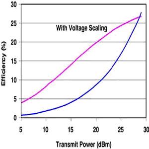 动态/可适性电压调整技术(DVS/AVS)与高整合度组件所使用的方式很类似,它会把闭回路系统中的处理器和稳压器连结在一起,并在确保系统正常工作的情形下,将数字电源供应的输出电压动态调整至最小值。功率放大器会被最佳化,使它在最大传送功率下拥有最高效率。由于绝大多数手机都在基地台附近工作,手机的无线电功能会在维持通讯质量的前题下,将传送功率降至最低水平。当功率放大器在较低的功率水平下工作时,它的效率会受到影响,从(图三)可以看出,利用动态电压调整技术来调整功率放大器的电压,它的工作效率会增加10%至20%。