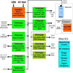 在此解决方案中,3.3VI/O电源是由SEPIC转换器提供,它让应用系统能充份利用锂离子电池电力,直到电池电压降至最低水平(大约2.7V)。和离散解决方案一样,稳压器输出也来自3.3V输入电源,以便提高工作效率。TPS65010采用48只接脚QFN封装,这些组件都内建FET晶体管。TPS61130SEPIC转换器采用4×4平方厘米QFN封装,并且内建FET晶体管,最高达到90%以上效率,TPS5100则是三通道输出控制器,专门用来提供电源给显示器。功率放大器和中央处理器电源使用的动态电压调整技术可以改善每颗零件的效率,进而协助降低功耗。